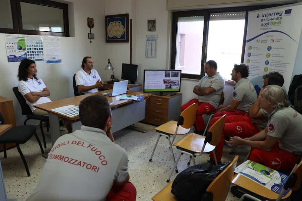 Attività: sono intervenuti Dario Garofalo, presidente dell’Associazione Marecamp (introduzione), la dott.ssa Clara Monaco (obiettivi e risultati preliminari di progetto, e azione “Sentinelle del Mare” per la raccolta dati sulla presenza e distribuzione delle specie marine, specialmente di quelle vulnerabili), la dott.ssa Carla Tumino (marine litter, plastiche in mare, e buone pratiche da adottare in mare), e il dott. Stefano Floridia (cetacei del Mediterraneo, codice di buona condotta per la loro osservazione, e spiaggiamenti).