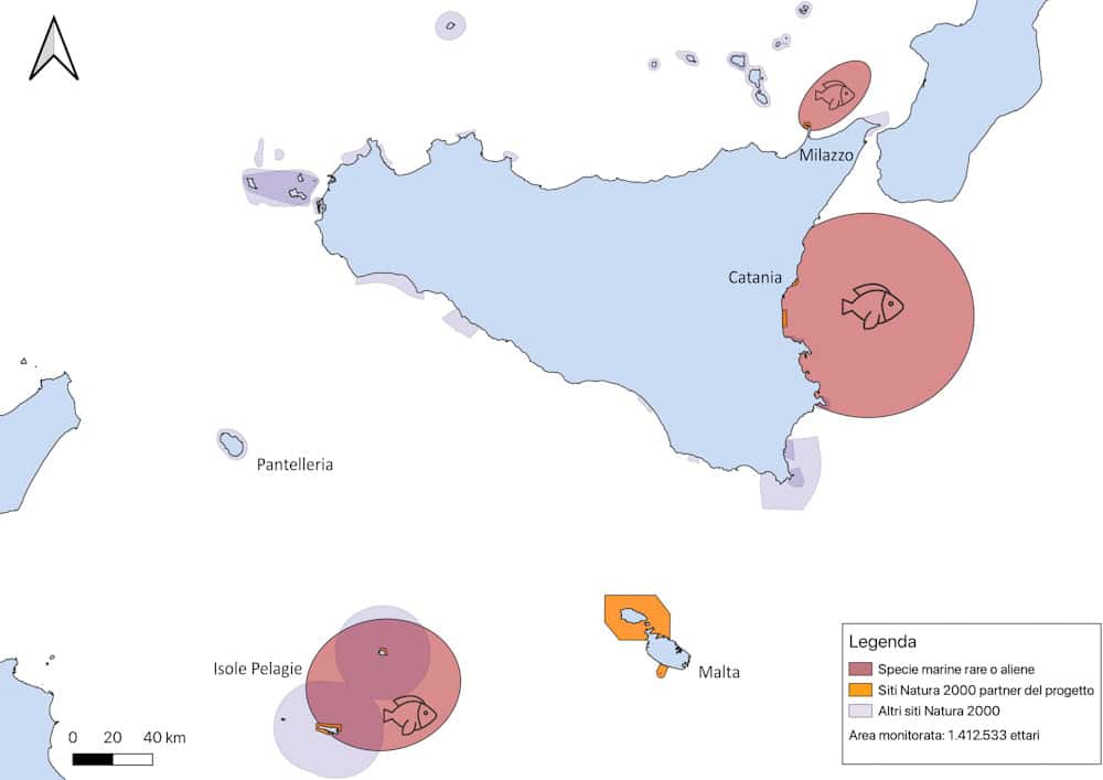 Figura 1 – Aree caratterizzate dalla presenza di specie marine rare o aliene (tra i più frequenti il pesce palla, il pesce flauto, e il pesce coniglio).