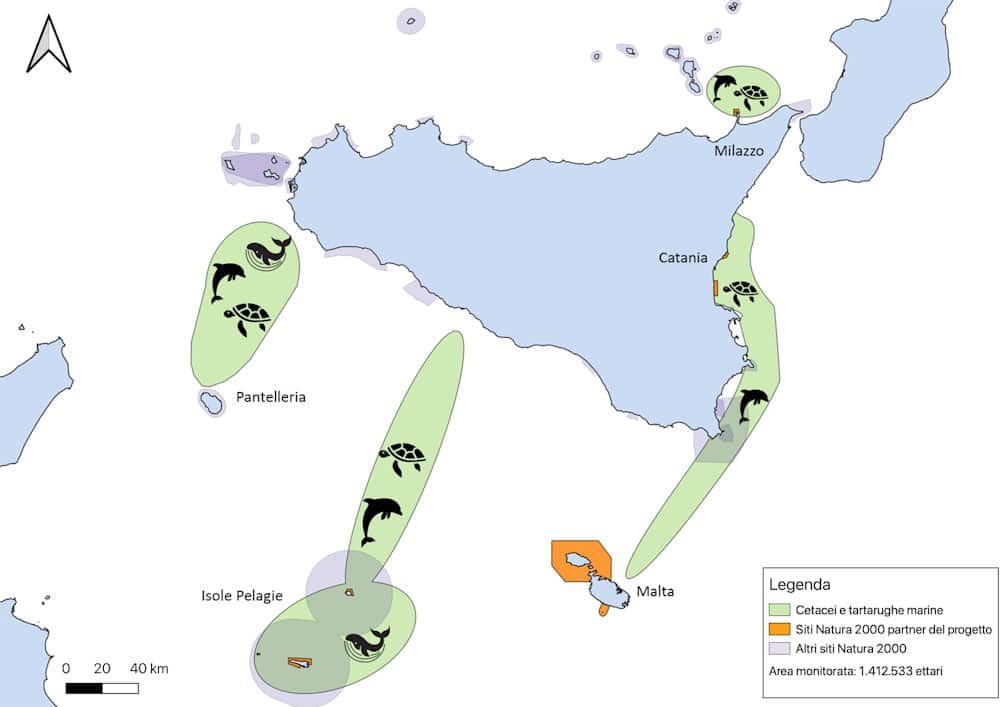 Figura 3 – Aree caratterizzate dalla presenza di cetacei (delfini e balene) e tartarughe marine.