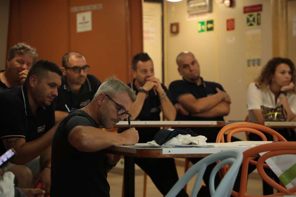 Il dottor Enrico Giarrusso ha condotto poi un’interessante sessione sull’identificazione delle specie vulnerabili nel Mediterraneo, con un focus su cetacei e tartarughe marine, coinvolgendo l’equipaggio in un vivace dibattito arricchito dalle loro esperienze in mare. Infine, la dottoressa Alessandra Raffa ha fornito indicazioni pratiche sulla gestione dei rifiuti e sull’importanza di prevenire l’inquinamento marino, incoraggiando l’equipaggio a segnalare avvistamenti e condizioni di inquinamento attraverso la piattaforma dedicata del progetto SEA MARVEL.